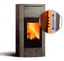Selbstverständlich wird auch für die DEKO-Feuerstätten echtes Naturmaterial verwendet: Mammutti-Speckstein. Dessen gleichmäßige innere Struktur wird bei DEKO Due in einer Doppelmantel-Bauweise ausgenutzt: Die Kombination aus schneller und langsamer Wärmeleitfähigkeit in Abhängigkeit der Maserung garantiert eine lang anhaltende und milde Wärme.